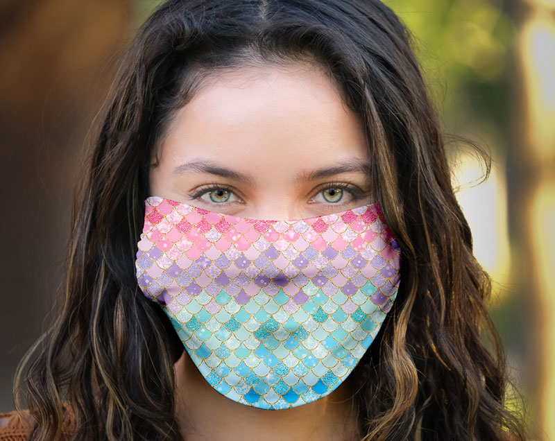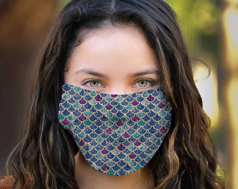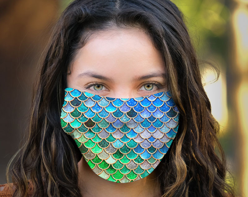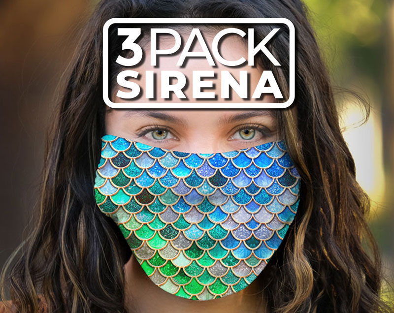 Pack de 3 Mascarillas de piel de sirena en azul y esmeralda, azul-mora y rosado de lycra suave, doble, sintética 100%, respirable. Ideal para protegerse. Nuestras mascarillas son lavables, livianas y ¡cómodas!