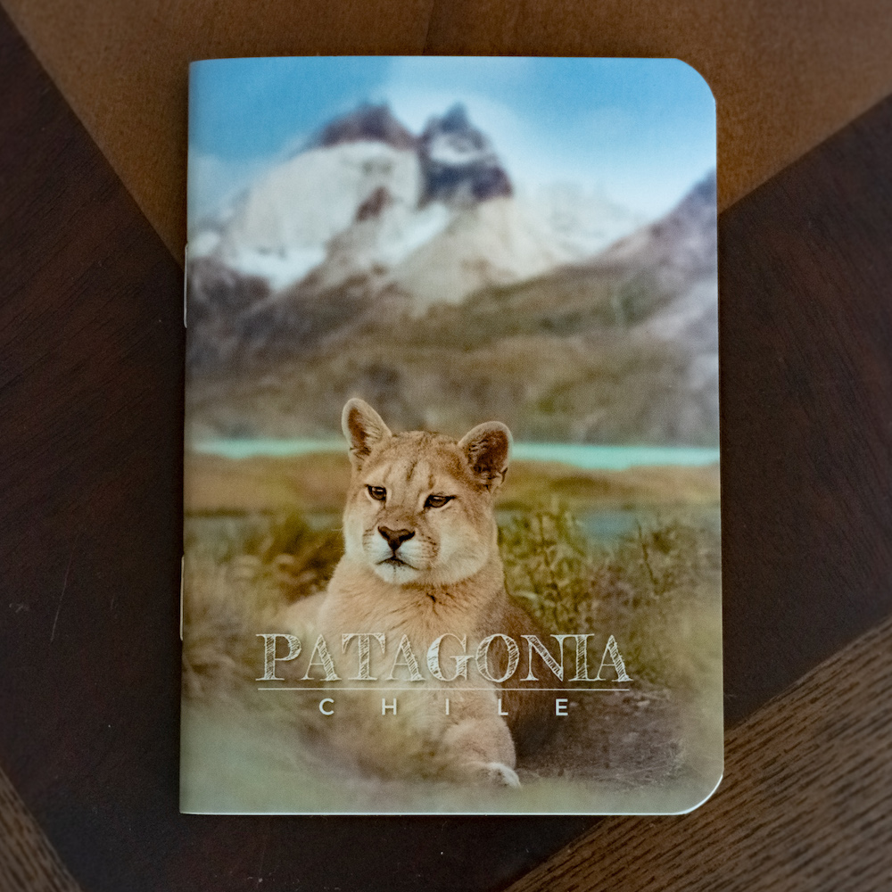 Hermosa libreta de PUMA y LOS CUERNOS DEL PAINE de tamaño “pasaporte” de 12 × 8.5 cms., impresa a todo color y forrada con polipropileno mate. Muy elegantes. Las tapas están hechas con papel especial de 280 gramos y las contra tapas están impresas con información temática y espacio para escribir datos personales. Tiene 64 páginas de papel ahuesado de 80 gramos. Un hermoso souvenir para uso personal o para regalar.