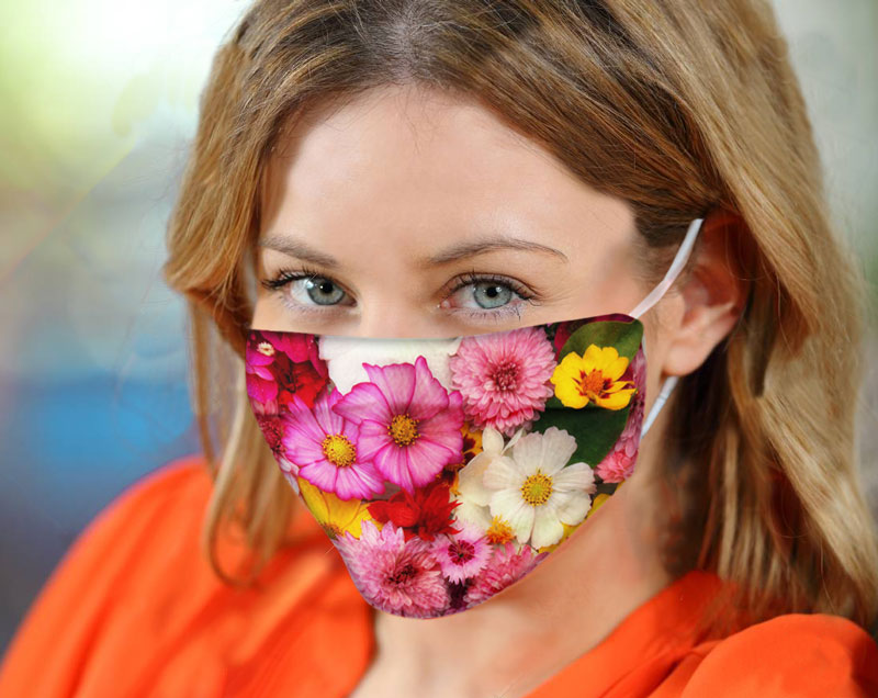 Mascarilla de flores rosadas y blancas hecha de lycra suave, doble, sintética 100%, respirable. Ideal para protegerse.