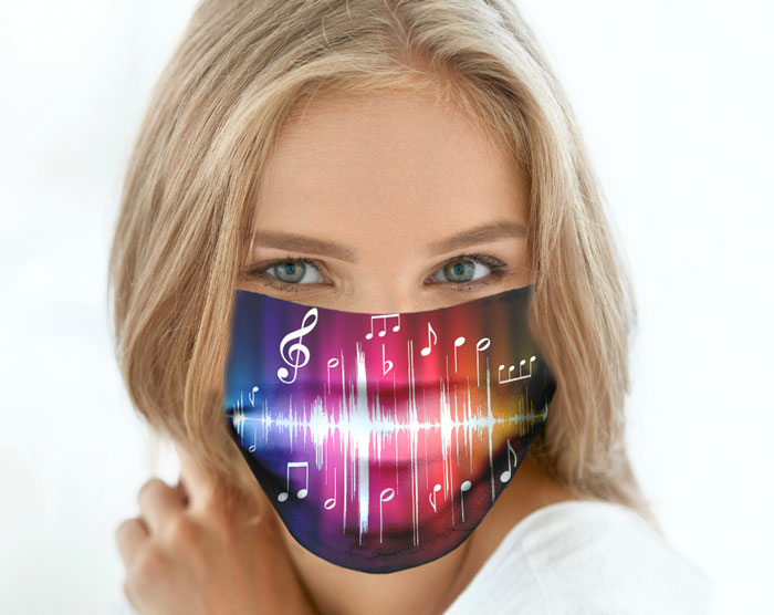 Mascarilla NOTAS MUSICALES hecha de lycra suave, doble, sintética 100%, respirable. Ideal para protegerse. Nuestras mascarillas son lavables, livianas y ¡cómodas!