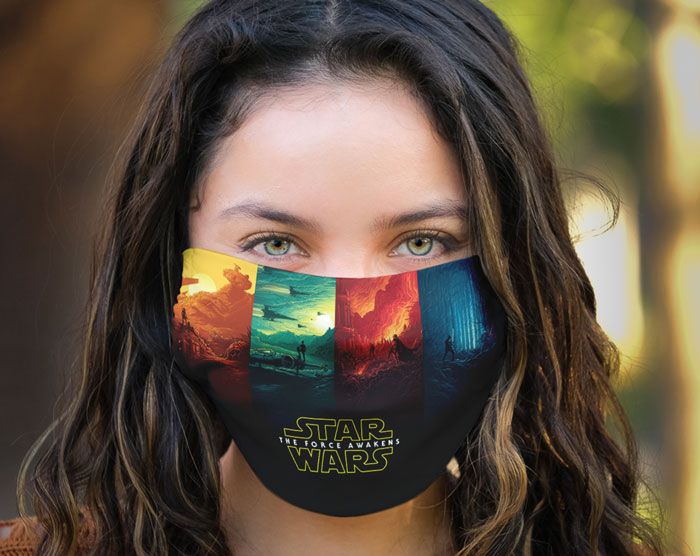 Mascarilla de lycra suave de personajes de THE FORCE AWAKENS, doble, sintética 100%, respirable. Ideal para protegerse. Nuestras mascarillas son lavables, livianas y ¡cómodas!