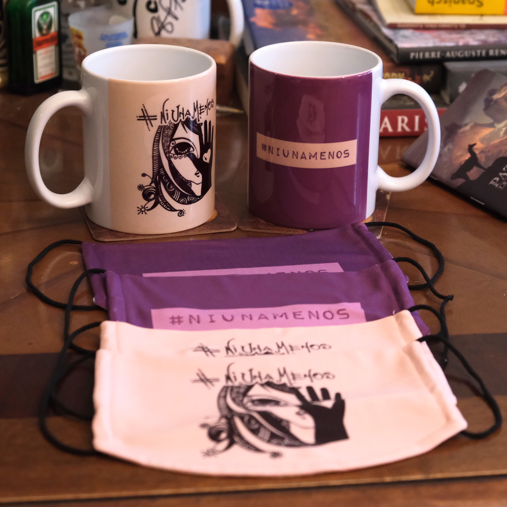 Pack de edición limitada de 2 tazas “Ni una Menos” de cerámica y 4 mascarillas “Ni una Menos” de lycra suave, doble, sintética 100%, respirable y una taza cerámica. Ideal para protegerse.